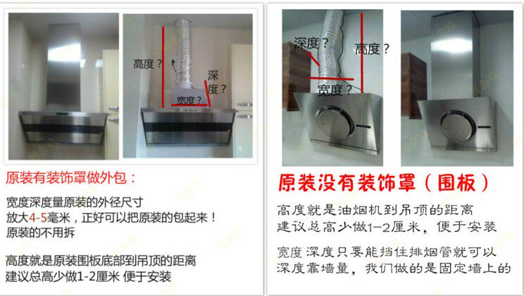 不锈钢板延长罩的尺寸需客户提供给本店客服,高度*宽度*深度,具体测量方法,请看下面介绍,下单以后尺寸是不可更改了,所以买家一定要测量准确。由于加工定制产品,全部为人工测量加工定做的,所以尺寸误差保证在正负1-2毫米以内。